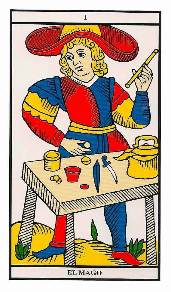 La figura de El Mago, de pie, ante su mesa de trabajo, en la que tiene expuestos diversos utensilios y adminículos representa la capacidad del individuo para enfrentarse a diversos quehaceres y situaciones con maestría, elocuencia, persuasión, conocimientos y sabiduría. Viene a indicar que el ser humano es como el malabarista que mantiene en danza, en movimientos sincronizados, varios objetos (conflictos familiares, problemas económicos o de salud, etc. captando la atención del público y procurando que no se caiga nada de sus manos, que no se rompa la armonía.