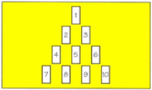 La fórmula a seguir será la siguiente: elegiríamos diez cartas y las colocaremos en el orden piramidal indicado. En la lectura procederemos a realizarla por hileras que comenzarán en el vértice de la pirámide, esa carta que se encuentra solitaria en la cúspide